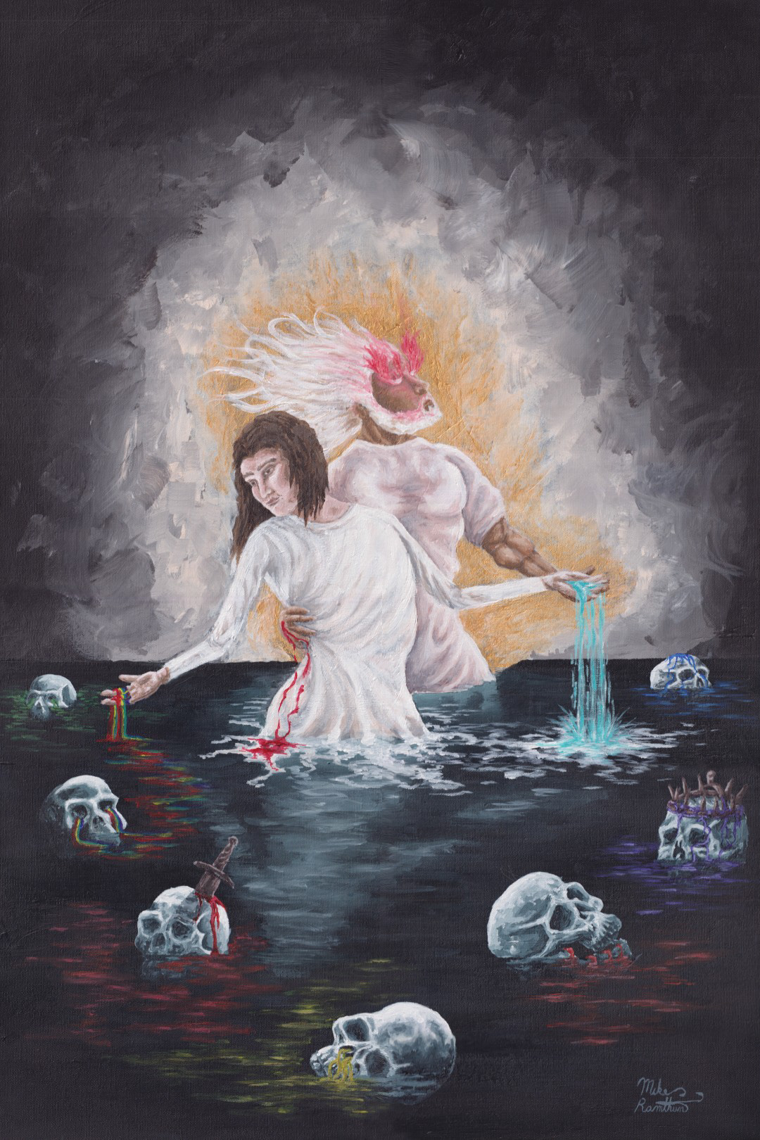 Christ in his glorified state guides his bride, the church, through the dark waters of this world. The waters are fully defiled by sin. Sin is depicted with seven human skulls secreting seven deadly sins. This represents the full and complete corruption that man's sin brought to the world and the death it brought. The church has become apathetic to the world around her. She willingly dips her hand into the waters to “test” what they will bring. Nevertheless, Christ continues to guide her towards salvation, giving her the sacraments that will sustain her, baptism in one hand and holy communion in the other. The reflection of Christ is not shown in the waters, but rather, Christ is reflected through His church.