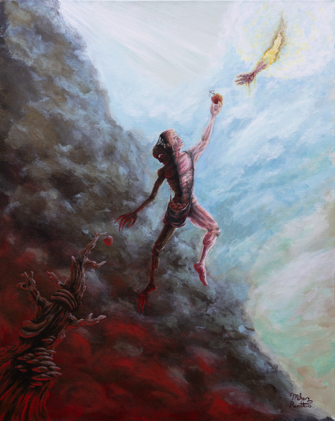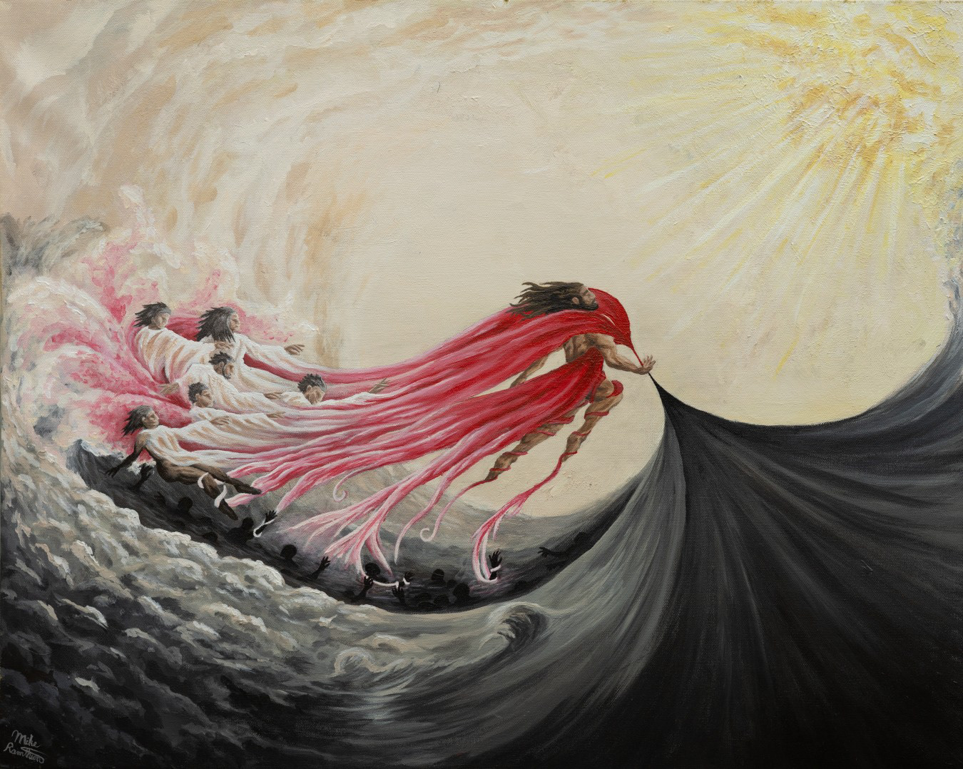 This acrylic painting is a depiction of the story of salvation that is laid out in Luther's hymn “Dear Christians, One and All, Rejoice”. All of mankind is trapped in the sea of sin. Christ swoops in, taking our sin on Himself, purifying us with His own blood. We are then clothed in His righteousness and led by Christ's example.